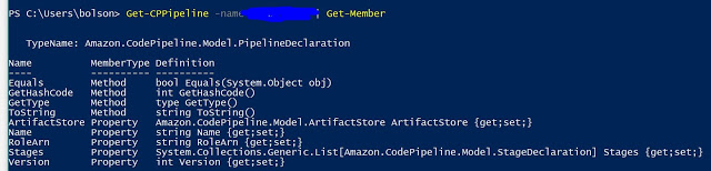 A handy dandy powershell command to know is “Get-Member” which returns the functions and properties of an object. Let’s give it a try on what’s returned from Codepipeline: